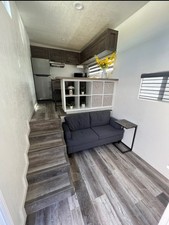 Professionally built with highest quality materials. • Full Bathroom: Shower Enclosure with Glass Door, Custom Vanity, Sink Faucet, Vanity Light with Exhaust Fan. • Triple Axle trailer 15,600 lbs rated w/ electric brakes full lights and rv leveling jacks.