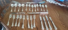 This set includes 4 forks, 4 knives, 4 desert forks, 4 soup spoons, 8 tea spoons, a caravaning knife, butter knife and two large serving spoons plus 8 napkin holders. All items are Stirling Silver