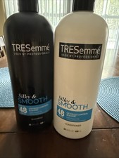 The TRESemme Smooth & Silky 48-hour Shampoo and Conditioner set is a custom bundle perfect for all hair types, especially those with frizz. With a soothing smoothing effect, this unisex product from the TRESemmé brand ensures a salon-quality result at home. Made in the United States, this set of 28 oz each is ideal for adults looking to achieve a sleek and silky finish to their hair for up to 48 hours.