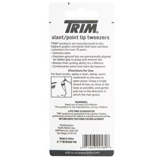 Stainless steel. Dual purpose. Combination point and slant tip tweezers. Keep your brows in check with the Trim Slant/Point Tip Tweezers. DIRECTIONS FOR USE: For best results, apply a clean, damp, warm washcloth to the area to open pores.