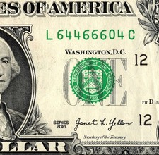 Trinary Fancy Serial Number One Dollar Bill L64466604C
