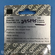 Manufacturer Part Number: 2241524. Manufactured by TRUMPF. Nozzle for Trumpf laser cutting machines, part of the EBC X35 series. Made for machines with or without PierceLine. Type: EBC X NOZZLE. The product images shown are for illustration purposes only and may not be an exact representation of the product you will receive.