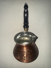This Turkish coffee pot is meticulously handcrafted from copper with tin inlining, making it a unique and traditional piece for collectors. The craftsmanship and materials used reflect the rich history and cultural significance of Turkish coffee tradition, adding charm and elegance to any collection.
