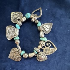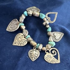 Turquoise Beaded Heart Charm Bracelet Silver Tone Adjustable Stretch Handmade