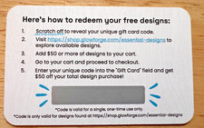 This listing is for two (2) $50 discount code cards totaling $100 for Glowforge Essential Designs. THE CARDS CANNOT BE USED TOWARD GLOWFORGE MATERIALS. It is for designs available through the Glowforge App only. The cards have not been scratched. I do not work for or with Glowforge and cannot answer any questions or address any issues you have with Glowforge or its products. Design prices in the Glowforge App vary.