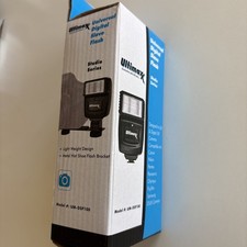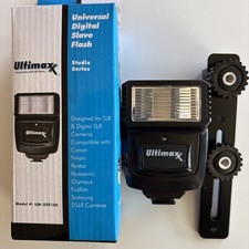 Ultimaxx UM-DSF100 Universal Digital Slave Flash with a mounting bracket New in box Ultimaxx UM-DSF100 Universal Digital Slave Flash with a mounting bracket. Compatibility: Designed for SLR and DSLR cameras from brands like Canon, Nikon, Pentax, Panasonic, Olympus, Fujifilm, and Samsung. Technology: Features an auto preset sensor for red-eye reduction and includes 3 different slave modes for remote photography. Design: Ultra-lightweight and compact design that utilizes 2 AA