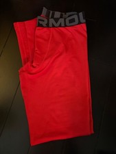 The product is a pair of Under Armour compression tights full length in youth size large. They feature a solid red color, athletic fit, and compression style. Designed for boys, these leggings are ideal for activewear occasions, particularly for running and jogging. Made from polyester blended fabric, these leggings are machine washable and perfect for the winter, fall, and spring seasons. With a pull-on closure and skinny leg style, these compression tights offer both performance and comfort for active young boys. Excellent condition! Worn once or twice