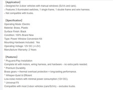 【Application】 - Designed for 2-door vehicles with manual windows (SUVs and cars). - Features 3 illuminated switches, 1 single frame, 1 double frame and wire harness. - Not compatible with trucks. 【Specification】 Operating Mode: Electric Material: Brass, Plastic Surface Finish: Black Condition: 100% Brand New Type: Power Window Conversion Kit Mounting Hardware Included: Yes Operating Voltage: 12V DC (+/-2V) Manufacture Warranty: 2 Years 【Features】 * Plug-and-Play Installation Complete kit with motors, wiring harness, and hardware – no extra parts needed. * Premium Durability Brass gears + thermal overload protection = long-lasting performance. * Whisper-Quiet & Efficient Low-noise motors with minimal power consumption (12V DC). * Universal F.