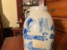 Here is a unique illegible script canning jar most likely from the Muskingum County area in Ohio. It looks like the word Ohio is spelled out if you use a little imagination? You be the judge, it's definitely an attempt with bad script. The crock measures 9 3/4'' tall. The crock is cracked on the bottom and on the side as the pictures will clearly show. Be sure to read the condition report and look at all the pictures before committing! Lower 48 states only.