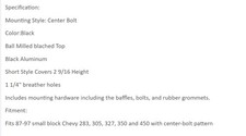 Specification: Mounting Style: Center Bolt Color:Black Ball Milled blached Top Black Aluminum Short Style Covers 2 9/16 Height 1 1/4" breather holes Includes mounting hardware including the baffles, bolts, and rubber grommets. Fitment: Fits 87-97 small block Chevy 283, 305, 327, 350 and 450 with center-bolt pattern Brand Unbranded Type Car Parts UPC Does not apply MPN Does not apply Item Length 20.882 Item Width 9.456 Item Height 4.334 Weight 6.908 Color Beige Material Corduroy .