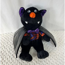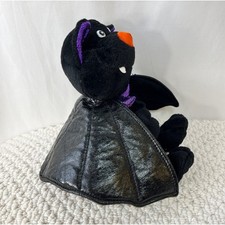 Very good preowned condition vampire bat plush. 9" full length. Black with plastic eyes and black cape. 15" wing to wing. Halloween calico print waistcoat. Chosun International.