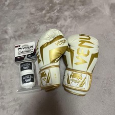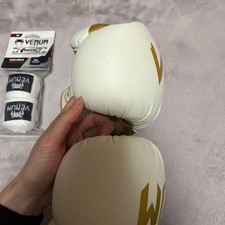 Details: Boxing gloves featuring a white and gold design, 8oz size, with bandage. Style: Boxing Gloves. Design: White and Gold. - Condition: Slightly dirty (see second image), but no tears.