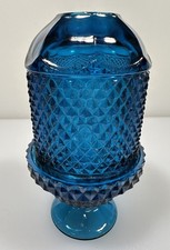 Viking Glass Diamond Point BLUE Fairy Lamp This vintage fairy lamp was manufactured by Viking Glass Company. Viking Glass Company was a prominent American manufacturer of decorative, mid-century modern glassware, based in New Martinsville, West Virginia, operating as Viking Glass Company from 1944 until 1984. Diamond point pattern and the color is BLUE đź’™ It does not glow under blacklight. It measures approx 6.5" tall, 2 pieces. There are no chips or cracks. See pictures for best description.
