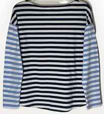 This Vineyard Vines Striped Knit Top is a versatile and classic addition to any wardrobe. Made from 100% cotton, this long sleeve pullover top features a relaxed fit and a boat neckline for a stylish look. The navy, white, and light blue stripes make it perfect for casual occasions or travel during the summer, fall, and spring seasons. With its easy care instructions and collarless design, this top is both comfortable and practical for everyday wear. Approximate measurements: Pit to pit: 21.5” Front length: 22.5” Ships fast from a smoke free environment.