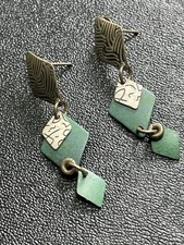 Vintage 1.6” Green Enameled Mixed Metal Dangle Earrings