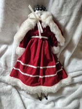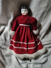 This 1900-1910 delicate and petite China Head Doll is marked with a 3. She is adorable in this velvet red winter outfit. She has wear on the back of her head, and she has a soft body.