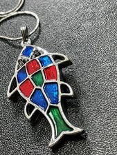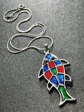 Vintage 18” Large Blue Red & Green Fish Pendent Silver Tone Chain Necklace