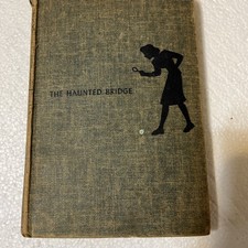 The product is a vintage 1937 edition of the Nancy Drew novel "The Haunted Bridge" by Carolyn Keene. This hardcover book was published by Grosset & Dunlap in New York and features illustrations by Russell H. Tandy. The special attributes of this 1st edition book include being illustrated and being part of the Nancy Drew character family, making it a collectible item for fans of mystery and thriller literature from the early 20th century.