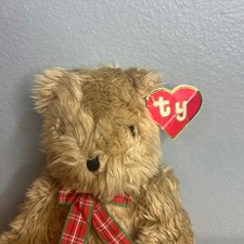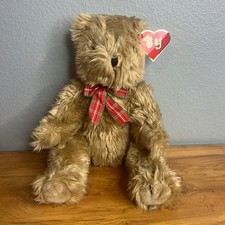 Ty Scruffy teddy bear plush toy with a classic brown, shaggy fur texture. Adorned with a festive red and green plaid tinsel ribbon around its neck. Character: Scruffy. Type: Plush Bear. Material: Plush, Fabric.