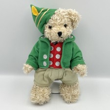 The bear features soft curly plush fur and wears a green jacket, white shirt with bow tie, and tan lederhosen-style pants with suspenders. He also has a green alpine hat with gold trim and yellow feather detail.