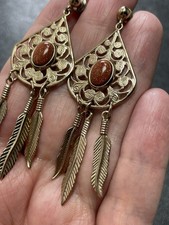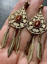 Vintage 2.5” Goldstone Dangle Leaf Feather Gold Tone Dangle Earrings