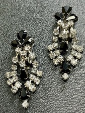 Vintage 2” High End Black Crystal Rhinestone Silver Tone Dangle Clip Earrings