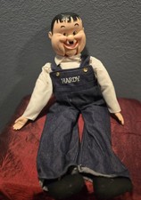 The Vintage 23" Hardy Ventriloquist Doll by Larry Harmon Pictures is a sought-after collectible item that is sure to appeal to vintage toy enthusiasts. This unique doll features the character Hardy and is described as being in good condition, despite missing its hat. With its vintage charm and brand history, this doll would make a valuable addition to any collection of vintage and antique toys. The mouth doesn't move. Missing hat & tie. Safety pin is holding back overhaul straps on.