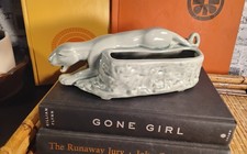The Vintage 8” Light Jade Green Panther Ceramic Planter is a charming mid-century piece of pottery from the 1950s. This figurine features a sleek design of a panther, adding a touch of retro style to any collection. Made in the mid-century era, this collector's item showcases the craftsmanship of the time and has not been modified to maintain its authenticity. Perfect for vintage enthusiasts looking to add a unique and whimsical piece to their home decor. This item is unmarked. There is some crackles and crazing. No cracks or chips. Measures 3.5 x 8 x 2.5. Please review all photos as they best describe the condition of this item. WE SHIP WITH CARE