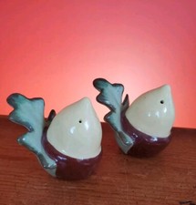 2 Acorn ceramic salt and pepper shakers in vintage pre Owned Condition With Some Crazing mostly on the salt shaker it also has a flea bite chip on the back side which is not noticeable from the front also both missing their plugs could not find another pair anywhere on the web thanks for Looking Lot 78