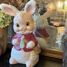 This product is a vintage hand-painted ceramic Easter bunny rabbit from Alberta Molds, made in the United States in 1986. As an original piece with no modifications, it would appeal to collectors of animal-shaped banks and other unique collectibles. The intricate details and hand-painted design make it a special addition to any collection, showcasing the craftsmanship and charm of a bygone era. Just in time for Easter.