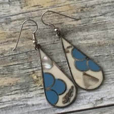 Vintage Alpaca Mexico Abalone Inlay Dangle Earrings Teardrop Shell Turquoise
