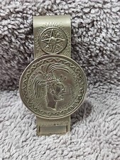 This vintage money clip from Mexico features intricate Aztec designs, crafted from alpaca silver. While it is not made of real silver, it still retains a unique and culturally significant aesthetic. Perfect for collectors of jewelry or those looking to add a touch of Mexican heritage to their accessories.