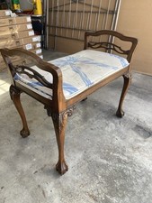 Vintage Antique Ball and Claw Ornate Bench. A wonderful find! Solid, sturdy for use, wonderful for display! Ornate carvings on each leg. Seat height is 18”, with side arms rising higher. Fabric needs to be recovered. Light normal use wear marks around to the finish. Only notable is the middle trim bar across one side. Has a cracked spot either some outer wood gone. View pics for details. Other side bar looks nice. A fabulous find for your home. They don’t make them like this anymore. Free shipping-All packaging and shipping included!