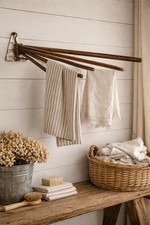 This classic folding rack expands outward to create multiple hanging points and folds flat against the wall when not in use. Expands smoothly to hold coats, towels, hats, or laundry. • Laundry room drying rack.