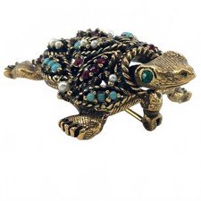 It is embellished with red and green glass rhinestones alongside turquoise-colored cabochons and white faux pearls. The piece showcases a characteristic whimsical style. The rollover safety clasp is fully functional.