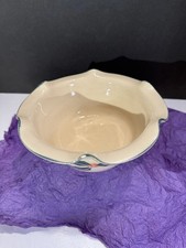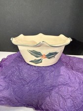 This vintage art studio pottery bowl, signed by Kovack, features a charming painted holly design. Crafted from stoneware using an art pottery production style, this unique piece adds a touch of nostalgia and character to any decor. Perfect for serving or displaying, this bowl is sure to be a conversation starter in any home. 7.3/4 by 3 inches in good condition. See pictures. has scalloped rim