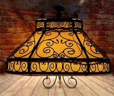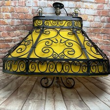Vintage Arts & Crafts Unique Wrought Iron Large Pendant Light Yellow Fabric