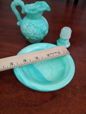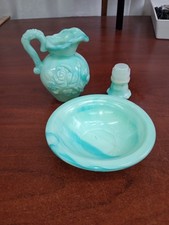 The Vintage Avon Rose Victorian Pitcher and Bowl set features a beautiful greenish blue design with a Victorian style. This collectible set includes a 6oz bottle with a rose pattern, perfect for decorative display. Made of glass, this set was manufactured by Avon in 1986 and would make a lovely addition to any collection of vintage decor. no chips or cracks.