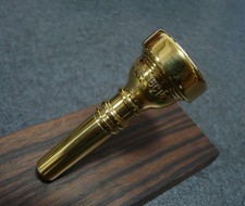 This is a Bach 5CFL trumpet mouthpiece, a rare model from the 1970s known as the "Fardot" short shank version. It features a 99% gold plate finish and is in excellent condition with no significant scratches.