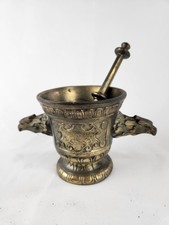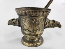 vintage brass eagle head pharmacy mortar and pestle. I believe this to be brass? Super heavy weighing 3.5 lb with Pestle included. Shows age wear and discoloration. Shows one mark on the inside, eagle handles solidly attached. Pre-owned, vintage condition. . As always, please look at detailed photos and ask questions before bidding/buying. We ship out Monday through Friday, usually within twenty four hours. Thank you for shopping with us!