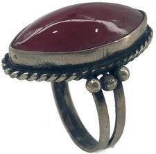 This ring features a large marquise-cut glass cabochon in a deep carnelian red hue. The stone is secured in a sawtooth bezel, accented by a twisted rope border and triple-bead metalwork on the shoulders. The split-shank band provides stability for the elongated setting. The silver-tone metal shows a natural aged patina consistent with vintage costume pieces. The glass surface is smooth with no visible chips. The construction is cast with applied decorative elements. This piece captures the desert-inspired aesthetic popular in mid-to-late century fashion. The vertical orientation creates an elongated look on the hand. It serves as a classic accessory for bohemian or western-themed wardrobes. Southwest Revival / Boho SIZE 6.5
