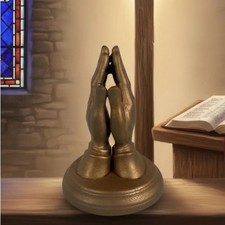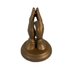 Beautiful vintage ceramic praying hands statue featuring a rich hand-painted gold finish and round pedestal base. A classic Christian decor piece perfect for prayer spaces, shelves, or religious displays. Details: • Vintage ceramic figurine • Hand-painted gold tone finish • Praying hands design on round base • Approx. 8 inches tall • Christian religious decor Condition: Pre-owned in good vintage condition with minor wear consistent with age. No visible cracks or chips noted. Great as a devotional accent, collectible religious decor, or thoughtful gift.