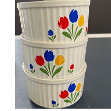 Whimsical charm defines this set of ceramic ramekins. Each dish features a delightful floral design with vibrant red, blue, and yellow tulips adding a touch of cheerful elegance. A perfect addition to any kitchen, these ramekins bring a blend of vintage style and practical use for individual desserts or savory dishes. Keywords: ramekins, souffle dishes, ceramic ramekins, vintage ramekins, floral ramekins, baking dishes, mini ramekins, dessert dishes, kitchenware, retro kitchen, cottagecore kitchen, vintage kitchenware, floral design dishes, ceramic bakeware