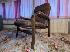 Beautiful lounge chair in a wonderful Danish Modern design original from the 60s. The frame of the armchair is made of brown-stained beech wood. The cover is made of brown faux leather. The Easy Chair is in used, very good vintage condition considering its age, see pictures. The backing fabric on the frame is no longer there, and the backing fabric on the cushion is torn at the seams. We ship the chair disassembled. Please note that the furniture is original from the 50s to 70s. Therefore, please do not expect new furniture; Superficial signs of wear are to be regarded as normal. We make every effort to describe any noticeable signs of wear and idiosyncrasies. This product is subject to differential taxation. Therefore, the VAT included in the purchase price is not shown separately on the.