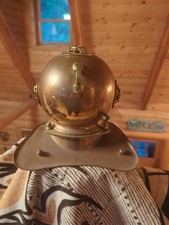 This vintage scuba diving helmet statue is a unique piece of nautical decor measuring 8 inches in height. Made of brass and copper, it captures the essence of maritime history and diving tradition. Perfect for collectors or those looking to add a touch of seafaring charm to their home or space, this statue is a timeless and elegant addition to any decor.