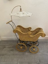 Vintage wicker and metal framed baby doll stroller that stands 2ft tall with an umbrella. In excellent condition