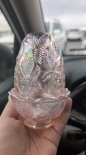 The perfect pink iridescent color. in the right light you can see purples and blues. there are no chips or cracks, this thing is an impeccable condition. it has a fainted mark on the bottom, and there's still a bit of the Fenton sticker remaining