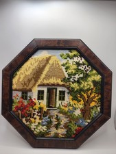 Vintage Framed Needlepoint Cottage and Garden Embroidery Handmade Wall Art