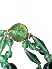 A beautiful vintage green glass beaded necklace featuring multiple strands of various shaped beads including round and elongated forms. The beads have a shiny finish that catches the light. The necklace measures approximately 12 inches in length as shown against a ruler for scale. A classic and elegant accessory suitable for various occasions.