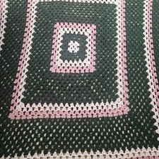 Vintage Hand Crocheted Granny Square Afghan Green White Pink 75"×65"